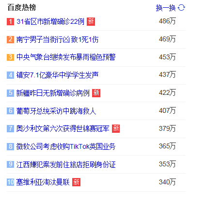 5.新疆昨日無(wú)新增確診病例 獵頭熱點(diǎn)熱度422萬(wàn)
