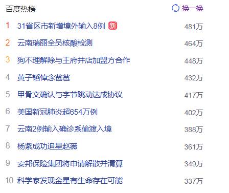 1. 31省區(qū)市新增境外輸入8例 獵頭熱點熱度481萬