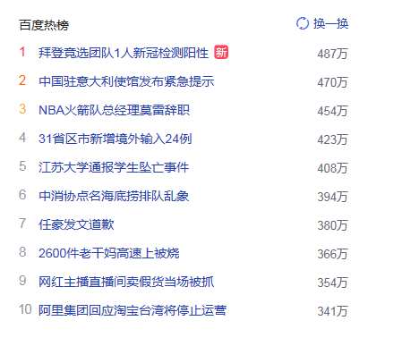 1. 拜登競選團隊1人新冠檢測陽性 獵頭熱點熱度487萬