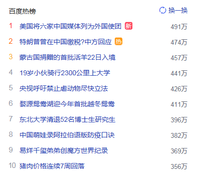 1. 美國(guó)將六家中國(guó)媒體列為外國(guó)使團(tuán) 獵頭熱度熱點(diǎn)491萬(wàn)